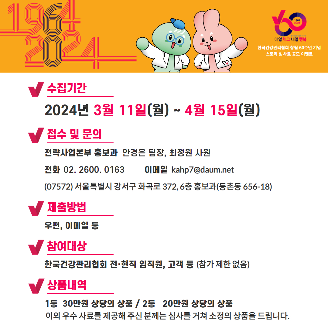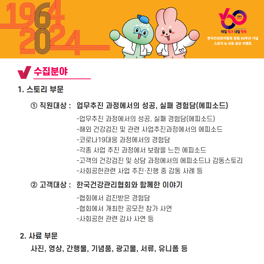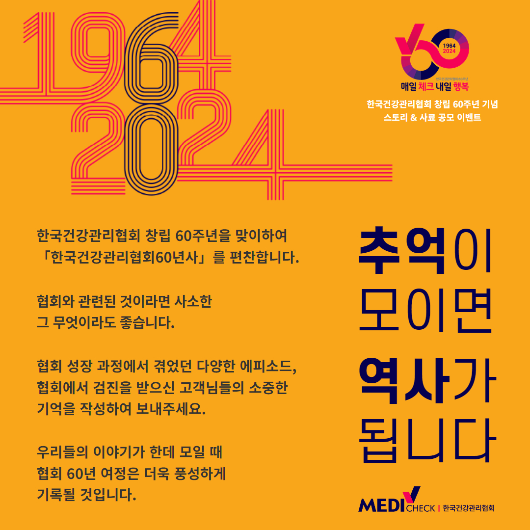 한국건강관리협회 창립 60주년을 맞이하여 스토리&사료 공모전을 실시합니다.