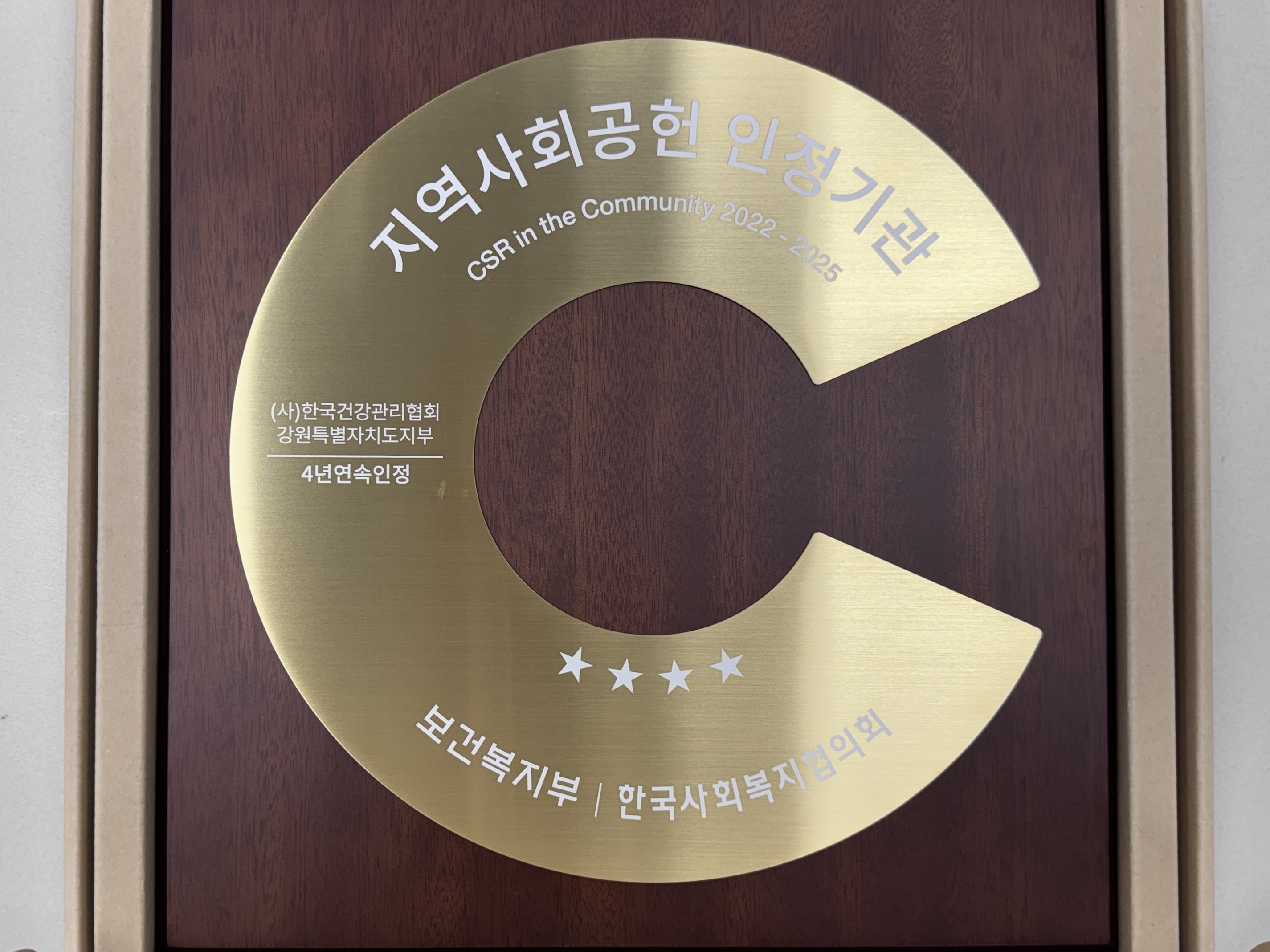 한국건강관리협회 강원특별자치도지부(본부장 고복희)는 2025년 지역사회공헌 인정제에서 4년 연속 인정기관으로 선정되어 공식 인정패를 전달받았습니다.